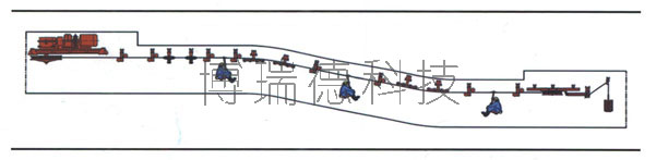 5、架空乘人裝置布置方式靈活、獨特。除布置在專用巷道外,還可以與皮帶輸送機共用巷道,也可以與單鉤提升絞車共用巷道。也可布置在小斷面巷道還可以通過單向往復(fù)運行實現(xiàn)小運量的人員輸送。